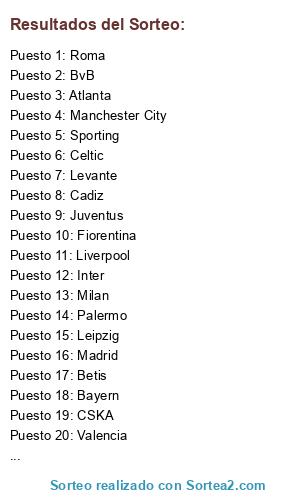 Lista de participantes: Manchester City, Fiorentina, Marsella, Palermo, Cadiz, Juventus, Inter, Celtic, Valencia, Morecambe, BvB, Espanyol, Levante, Leicester, Ajax, Bayern, Betis, Roma, Barcelona, Sporting, Leipzig, Madrid, Atlanta, CSKA, Manchester United, Milan, West Ham, Las Palmas, Liverpool, Mallorca.