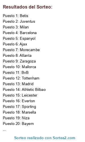Lista de participantes: Atlanta, Mallorca, Levante, Everton, Milan, Marsella, Morecambe, Roma, Espanyol, Ajax, Niza, Manchester United, BvB, Tottenham, Fiorentina, Bayern, Betis, West Ham, Zaragoza, Valencia, Inter, Sporting, Madrid, Leicester, Juventus, Manchester City, Athletic Bilbao, Liverpool, Barcelona, Rangers.