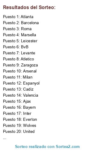 Lista de participantes: Morecambe, BvB, Atlanta, Atletico, Niza, Levante, Cadiz, Arsenal, Fiorentina, Inter, Milan, Tottenham, Madrid, Betis, Valencia, Espanyol, Wolves, Ajax, Marsella, Mallorca, City, Roma, Liverpool, PSG, Bayern, Barcelona, United, Zaragoza, Everton, Leicester.
