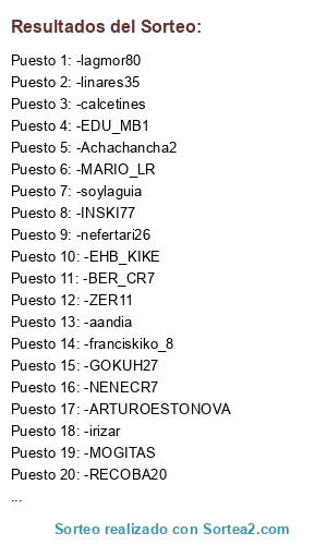 Lista de participantes: -lagmor80, -INSKI77, -linares35, -EDU_MB1, -irizar, -ralalarcn, -ignaciovp, -Enosthar, -aandia, -NENECR7, -nefertari26, -EHB_KIKE, -RECOBA20, -soylaguia, -ELMUMO, -ELOSKARON, -GURRIPULLI, -MOGITAS, -ZER11, -ARTUROESTONOVA, -reywwf619, -franciskiko_8, -BER_CR7, -GOKUH27, -Roberto_69_89, -Achachancha2, -calcetines, -Dmolina87, -victor89, -MARIO_LR.