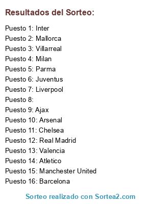 Lista de participantes: Inter, Arsenal, Ajax, Atletico, Chelsea, Parma, Racing, Valencia, Juventus, Barcelona, Real Madrid, Manchester United, Milan , Liverpool, Villarreal, Mallorca, .