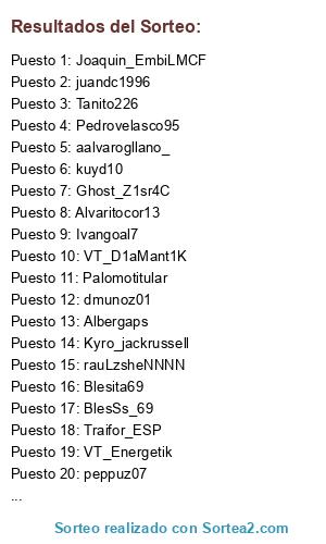 Lista de participantes: Beivi, Pregal, Xcorpiom, Jonyrambo, Parrita, Mindix, Frakotirador, Luna, Danivalde, Snake 0012, Anicolao, Havi Stae, JorgeNeymar, Padrone, Jonan, Emilio Snake, Sentenza, Eckae, Nutria, Fein, King Magic, Kantus, Fermin, Qememetes.