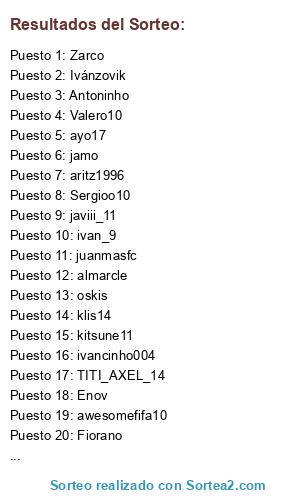 Lista de participantes: javiii_11 , oskis, almarcle, Sergioo10, mark_17, ivancinho004, BRT21, kitsune11, jamo, Ivánzovik, TITI_AXEL_14, Bass120, Fiorano, Sarkus, Oskarjugon, Antoninho, Valero10, Enov, Barambambiron, Zarco, adrian_xta, ivan_9, Nevi, awesomefifa10, aritz1996, juanmasfc, Al_pacino, litos_better, ayo17, klis14.