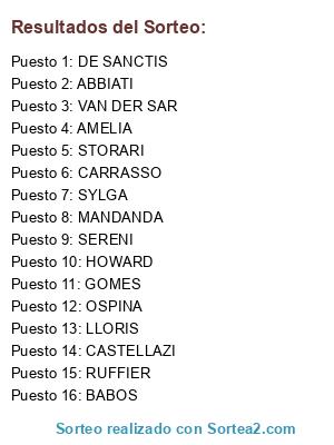Lista de participantes: LLORIS, STORARI, RUFFIER, OSPINA, MANDANDA, ABBIATI, SERENI, HOWARD, GOMES, VAN DER SAR, BABOS, CARRASSO, DE SANCTIS, CASTELLAZI, AMELIA, SYLGA.