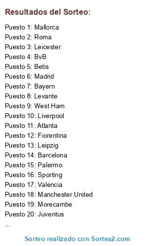 Lista de participantes: Leicester, Milan, Barcelona, Madrid, Betis, Celtic, Atlanta, Morecambe, Levante, West Ham, Bayern, Juventus, Inter, Roma, Las Palmas, Cadiz, Palermo, Fiorentina, Valencia, BvB, CSKA, Sporting, Liverpool, Espanyol, Manchester City, Ajax, Manchester United, Mallorca, Marsella, Leipzig.