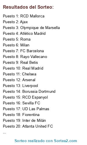Lista de participantes: Manchester United, Borussia Dortmund, Real Madrid, Inter de Milán, FC Colonia, Ajax, Atlanta United FC, FC Barcelona, Roma, Lazio, Real Zaragoza, Milan, FC Bayern Munich, Celtic, RCD Espanyol, RCD Mallorca, Atlético Madrid, Real Betis, Arsenal, UD Las Palmas, Paris Saint-Germain, Manchester City, Fiorentina, Rayo Vallecano, Sevilla FC, Olympique de Marsella, Sampdoria, Valencia CF, Liverpool, Chelsea.