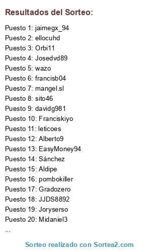 Lista de participantes: Aldipe, Adri_casti90, Josedvd89, ai-man-lol, enpho, Joryserso, pablo1093, Midaniel3, Danimese, Quiron888, Gons10, francisb04, fornides, apaez91, wazo, referee_21, pedroeloy95, danicozarch_25, mangel.sl, EduCM, Chemita1993, Orbi11, leticoes, JJDS8892, angei88, sito46, davidg981, alexmar_93, ellocuhd, JonanPB8, Uve_mula, sanmiguel25, Franciskiyo, EasyMoney94, Lokikolirota, pombokiller, jaimegx_94, Gradozero, Sánchez, Alberto9.