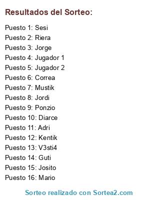Lista de participantes: V3sti4, Guti, Ponzio, Sesi, Mario, Adri, Kentik, Jordi, Jorge, Riera, Mustik, Jugador 1, Josito, Correa, Diarce, Jugador 2.