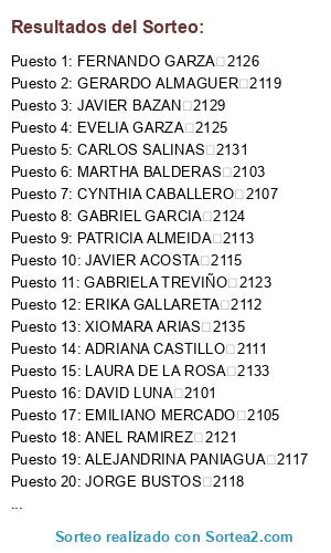 Lista de participantes: ADRIANA CASTILLO 2111, ALEJANDRINA PANIAGUA 2117, ANA LOPEZ 2122, ANEL RAMIREZ 2121, ARMANDO WELSH 2120, CARLOS SALINAS 2131, CYNTHIA CABALLERO 2107, DAVID LUNA 2101, EMILIANO MERCADO 2105, ERIKA GALLARETA 2112, EVELIA GARZA 2125, FERNANDO GARZA 2126, GABRIEL GARCIA 2124, GABRIELA TREVIÑO 2123, GERARDO ALMAGUER 2119, JAVIER ACOSTA 2115, JAVIER BAZAN 2129, JORGE BUSTOS 2118, JULIAN SANCHEZ 2116, LAURA DE LA ROSA 2133, MARTHA BALDERAS 2103, PATRICIA ALMEIDA 2113, RUBEN REBOLLOSO 2114, XIOMARA ARIAS 2135.
