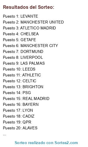 Lista de participantes: HUESCA, SPURS, CADIZ, DORTMUND, SEVILLA, ATLETICO MADRID, FUENLABRADA, PSV, MANCHESTER UNITED, MANCHESTER CITY, VILLARREAL, LEEDS, LAS PALMAS, REAL BETIS, GIRONA, LYON, LEVANTE, BRIGHTON, GETAFE, VALENCIA, PSG, MILAN, REAL MADRID, PAULI, OSASUNA, ATHLETIC, BAYERN, LIVERPOOL, CHELSEA, ALAVES, CELTIC, QPR.
