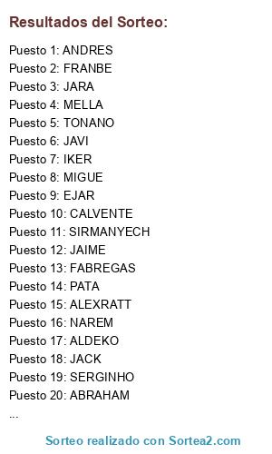 Lista de participantes: JARA, MOISES, GOMETE, NAREM, EJAR, CALVENTE, JACK, BERTO, FELIX, ALEXRATT, DANI, DAVIDGV, ANDONI, SACISTO, STRONG, SERGINHO, MELLA, IKER, ABRAHAM, PATA, FRANBE, MARKITOS, FIGO, ALDEKO, JAIME, PABLOMURCIA, SIRMANYECH, MIGUE, JAVI, FABREGAS, TONANO, ANDRES.