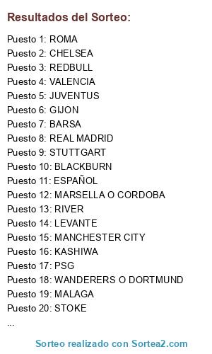Lista de participantes: VALENCIA, OVIEDO, WEST HAM O LIVERPOOL, BOCA, DEPORTIVO, VILLARREAL, GIRONDINS, UNITED, REAL MADRID, LEVANTE, CELTIC, CHELSEA, CITY, PSV, AJAX, PSG, ATLETICO MADRID, SEVILLA, BARCELONA, BAYERN, OSMANLISPOR, JUVENTUS, NEWCASTLE, NIZA, SPURS, DORTMUND, SHAKTHAR, OPORTO, NAPOLES, OSTERSUNDS, BETIS, MALAGA.