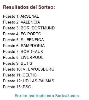 Lista de participantes: UD LAS PALMAS, BOR. DORTMUND, SAMPDORIA, PSG, BORDEAUX, CELTIC, BETIS, VALENCIA, FC PORTO, SL BENFICA, LIVERPOOL, ARSENAL, VFL WOLSBURG.