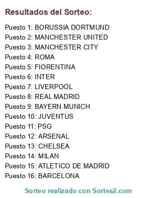 Lista de participantes: PSG, ROMA, FIORENTINA, INTER, MILAN, JUVENTUS, REAL MADRID, BARCELONA, ATLETICO DE MADRID, ARSENAL, CHELSEA, LIVERPOOL, MANCHESTER CITY, MANCHESTER UNITED, BAYERN MUNICH, BORUSSIA DORTMUND.
