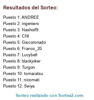 Lista de participantes: Seiya, Nashoif9, Turgon, Lucybell, tomaratsu, ANDREE, blackjoker, nicomati, ingeniero, Franco_20, Giocoronado, CNI.