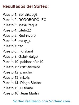 Lista de participantes: cristianrivero, Diego Blinder, Juan Martin, Lutriano, GabiHidalgo, MaxiOreglia, Soflylikeag6, moraland, maxy_4, RODOBODOLFO, Rodririvero, pitufo22, pablosonfire10, nikofs, fito, pancho.