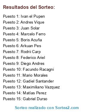 Lista de participantes: Facundo Racagni, Arkuan Pes, Diego Andres, Gabriel Durso, Federico Ariel, Rodrii Carp, Mario Morales, Maximiliano Vazquez, Marcelo Ferro, Boris Acuña, Andres Vique, Matías Perez, Gadiel Santander, Ivan el Pupen, Juan Solar.