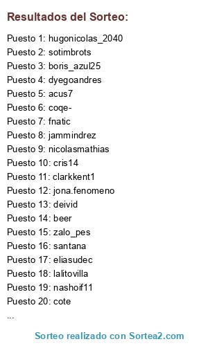 Lista de participantes: jona.fenomeno, cris14, nicolasmathias, zalo_pes, coqe-, smert619, hugonicolas_2040, dyegoandres, clarkkent1, eliasudec, deivid, acus7, lalitovilla, jammindrez, nashoif11, daniel_ignacio, santana, diegoweed, boris_azul25, fnatic, sotimbrots, cote, kelacoa, beer.