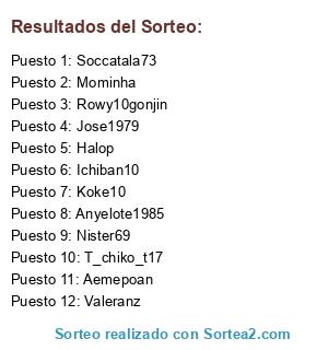 Lista de participantes: Anyelote1985, Mominha, Rowy10gonjin, Soccatala73, Koke10, Aemepoan, Ichiban10, T_chiko_t17, Nister69, Halop, Jose1979, Valeranz.