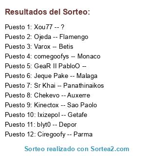 Lista de participantes: Ojeda -- Flamengo, Ixizepol -- Getafe, Varox -- Betis, Jeque Pake -- Malaga, blyt0 -- Depor, Xou77 -- ?, Kinectox -- Sao Paolo, Chekevo -- Auxerre, comegoofys -- Monaco, Sr Khai -- Panathinaikos, Ciregoofy -- Parma, GeaR II PabloO --.