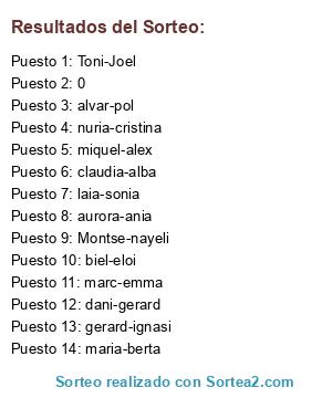 Lista de participantes: Montse-nayeli, Toni-Joel, claudia-alba, gerard-ignasi, miquel-alex, aurora-ania, biel-eloi, maria-berta, dani-gerard, alvar-pol, nuria-cristina, laia-sonia, marc-emma, 0.