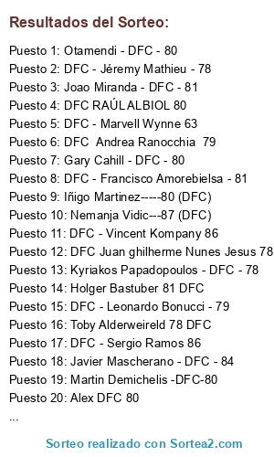 Lista de participantes: DFC Andrea Ranocchia 79, DFC Felipe augusto santana 77, DFC Juan ghilherme Nunes Jesus 78, Javier Mascherano - DFC - 84, Otamendi - DFC - 80, Matt Hummels - DFC - 85, Holger Bastuber 81 DFC, Carles Puyol 83 DFC, Toby Alderweireld 78 DFC, Younes Kaboul---80 (DFC), Nemanja Vidic---87 (DFC), Iñigo Martinez-----80 (DFC), Martin Demichelis -DFC-80, Gary Cahill - DFC - 80, Philipp Lahm - DFC - 87 , John Terry DFC- 83, Alex DFC 80, DFC - Marvell Wynne 63, DFC - Sergio Ramos 86, DFC - Vincent Kompany 86 , DFC - Jéremy Mathieu - 78, DFC - Ricardo Costa - 77, DFC - Leonardo Bonucci - 79, DFC - Francisco Amorebielsa - 81, Joao Miranda - DFC - 81, Kyriakos Papadopoulos - DFC - 78, Benedikt Howedes - DFC - 82 , DFC RAÚL ALBIOL 80.