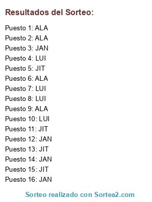 Lista de participantes: ALA, ALA, ALA, ALA, JAN, JAN, JAN, JAN, JIT, JIT, JIT, JIT, LUI, LUI, LUI, LUI.