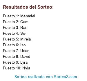 Lista de participantes: Cam, Menadel, Urian, Lyra, Rai, Iso, Nyla, Siv, David, Mireia.