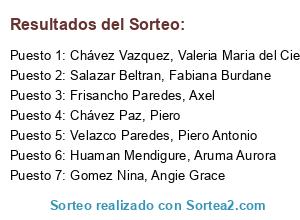 Lista de participantes: Chávez Paz, Piero, Chávez Vazquez, Valeria Maria del Cielo, Frisancho Paredes, Axel, Gomez Nina, Angie Grace, Huaman Mendigure, Aruma Aurora, Salazar Beltran, Fabiana Burdane, Velazco Paredes, Piero Antonio.