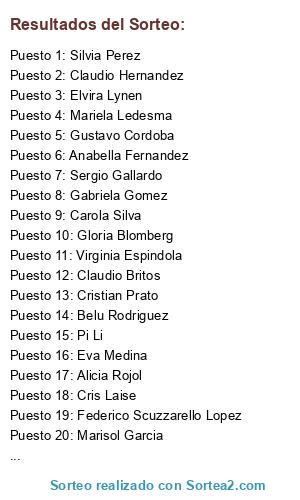 Lista de participantes: Cris Laise, Ana Clara Lynen, Gabriela Gomez, Alicia Rojol, Mariela Ledesma, Cristian Prato, Marisol Garcia, Claudio Hernandez, Gloria Blomberg, Florencia Lynen, Myriam Liendo, Betty Javkin, Gustavo Cordoba, Claudio Britos, Federico Scuzzarello Lopez, Elvira Lynen, Virginia Espindola, Belu Rodriguez, Larita Bonifati, Anabella Fernandez, Gaby Otta, Carola Silva, Silvia Perez, Pi Li, Eva Medina, Sergio Gallardo.