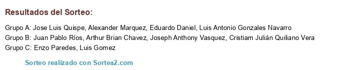 Lista de participantes: Juan Pablo Ríos, Arthur Brian Chavez, Luis Antonio Gonzales Navarro, Eduardo Daniel, Jose Luis Quispe, Joseph Anthony Vasquez, Cristiam Julián Quiliano Vera, Luis Gomez, Enzo Paredes, Alexander Marquez.