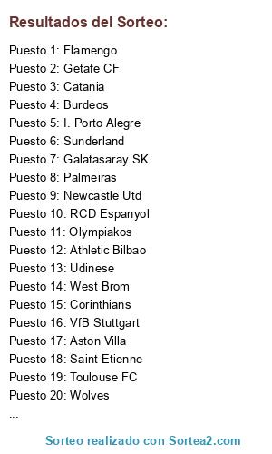 Lista de participantes: 1. FC Koln, 1899 Hoffenheim, FC Schalke 04, Hamburger SV, Hannover 96, VfB Stuttgart, VfL Wolfsburg, Werder Bremen, Corinthians, Cruzeiro, Flamengo, Fluminense, I. Porto Alegre, Palmeiras, Santos, Sao Paulo, Athletic Bilbao, Getafe CF, RCD Espanyol, Burdeos, Montpellier HSC, Saint-Etienne, Stade Rennes, Toulouse FC, Ajax, PSV, Aston Villa, Blackburn Rvrs, Bolton, Everton, Fulham, Newcastle Utd, Stoke City, Sunderland, West Brom, Wolves, Cagliazzo, Catania, Genova CFC, Palermo, Parma, Udinese, SC Braga, Galatasaray SK, Olympiakos.