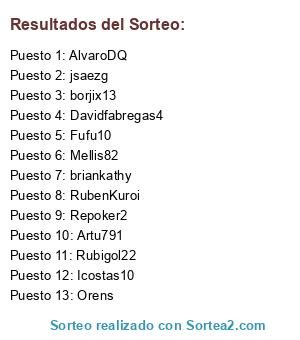 Lista de participantes: Icostas10, Repoker2, Davidfabregas4, briankathy, Mellis82, jsaezg, RubenKuroi, Artu791, Fufu10, Rubigol22, borjix13, Orens, AlvaroDQ.