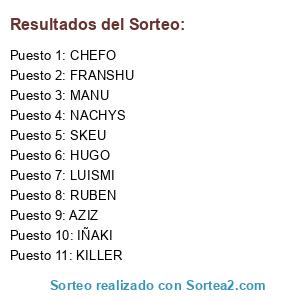 Lista de participantes: SKEU, KILLER, IÑAKI, RUBEN, MANU, LUISMI, CHEFO, HUGO, FRANSHU, AZIZ, NACHYS.