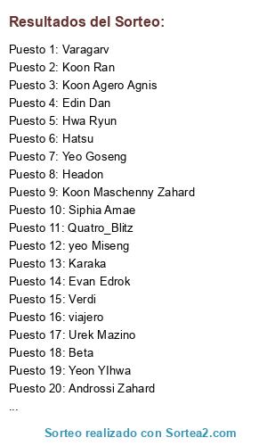 Lista de participantes: Urek Mazino, Black March, Beniamino Cassano, Beta, Androssi Zahard, yeo Miseng, Verdi, Koon Maschenny Zahard, Ha Jinsung, Quant Blitz, Lero-Ro, Anak Zahard, Ja Wangnan, Yuri Zahard, viajero, Varagarv, Yeon YIhwa, Phonsekal Laure, Ship Leesoo, Evan Edrok, Baam/Viole, Hatsu, Mule Love, Kang Horyang, Quatro_Blitz, Novick, Rak Wraithraiser, Koon Agero Agnis, Koon Ran, Hwa Ryun, prince, Koon Hachuling, Edin Dan, Xia Xia, Headon, Yu Han Sung, Parakwel, Aleksai Amigochaz, Lo Po Bia Ren, Ho, Sunwoo Nare, Koon María Zahard, Yeo Goseng, Yuje, Karaka, Emily, Chang vlador, Jaina Repellista Zahard, Siphia Amae, Reflejo, Yuto.
