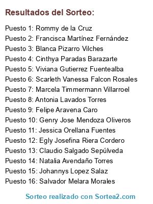 Lista de participantes: Carla Trujillo Ibarra, Claudio Salgado Sepúlveda, Javiera Estay Barrientos, Jessica Orellana Fuentes, Macarena Diaz Godoy, Marcela Timmermann Villarroel, Milton Castro Ruiz, Salvador Melara Morales, Viviana Gutierrez Fuentealba, Gustavo Torres Vera, Francisco Alberto Cortez Zúñiga, Felipe Aravena Caro, Egly Josefina Riera Cordero, Genry Jose Mendoza Oliveros, Johannys Lopez Salaz, Dairon De la Cruz Carrillo, Juan Pablo Sousa Pedro, Paulina Fernanda Quintana Pizarro, Dariel Pastenes lagos, Carolina Betzabe Miranda Nuñez, Scarleth Vanessa Falcon Rosales, Ronald Vergara Muñoz, Antonia Lavados Torres, Cinthya Paradas Barazarte, Gabriel Silva Colmenares, Pamela Varas Varas, Wilson Jimenez Cornejo, Natalia Avendaño Torres, Rommy de la Cruz, Carlos Contreras, Angélica Almarza Espinoza, Giovanni Barragan Garcia, Francisco Peña Mosquera, Maria Fernanda Sousa Pedro, Juan Carlos Segura Matamala, Francisca Martínez Fernández, Blanca Pizarro Vilches, Paola Ortiz, Edgar Baptista Esparza, Yesenia Mamani Zanabria, Alberto Romero Kessra, Pamela Catrileo Mariqueo, Claudia Barros Ruz, Eduardo Raul Hurtado Navarro, Richard Osvaldo De Andrade Gomes, Karla Andrea Marne Pinto Esquivel, Sergio Perez Parraguez, Alejandra Cardenas.