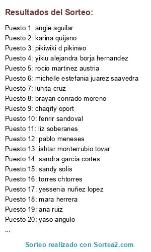 Lista de participantes: yessenia nuñez lopez, maggy madeleine garcia, aurea rivero, ahora solo gabriel, danny lopez samperrio, edith cruz, pablo meneses, ismaa cabrera guzman, karina quijano, J. E., haslett vianney acevedo godinez, abigail navarro, itzel jocelyn ro, betania legorreta, pikiwiki d pikinwo, jacquelines dominguez ordoñez, iris cruz, shaila martinez, lunita cruz, qarenxiiuz garcia, oswa aren, rubi gro, eva sp, abbyy raastaa, guadalupe lugo hernandez, karen gonzalez pontaza, chaqrly oport, ailyn r. vazquez, michelle estefania juarez saavedra, vianey reynoso andablo, nancy zambrano, yenn hernandez, gaby del villar villegas, sandy solis, ale vzq, adirh del angel, torres chtorres, rocio martinez austria, indira stephanie garcia lopez, salvador carrillo, gab frapp, sandra garcia cortes, nelly mazzocco, au pm, lilian garcia vazquez, cristhian efren hernandez, lizz salazar bautista, dulzecita cano perez, brayan conrado moreno, judith lp, mara herrera, yeniza montoya, ana ruiz, edgar carrasco, carlos tapia lopez, suavecito barrio jackson, carol escamilla, liz soberanes, mara ruiz vega, miguel angel canales, gaby islas, ade gutierrez cruz, janeth h lira, mary anny, mari flores, nayeli lara, angeles tapia silva, yaso angulo, patty hernandez, anub gutierrez, judith ocampo viruegas, claudia gonzalez, lupita hg hg, mariana zamora curiel, fenrir sandoval, elizabeth islas, dian garcia, vivi lop, flor hdez, patricia leonar, yaz sanvel, montserrat villareal, mimish juarez, jose antonio gutierrez coll, jorge rodolfo osorno, ishtar monterrubio tovar, jhordan solis, angie aguilar, mayeli vazquez, avelyn lozano, marisol dorantes, yazmin isabel, jovani lira, yikiu alejandra borja hernandez, monkikiz rodriguez, mary lolis saavedra, judith solis, alejandra flores, monica trejo, diana gabriela cruz camacho.