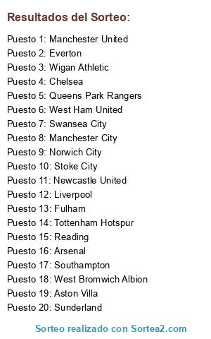Lista de participantes: Manchester United, Manchester City, Chelsea, Arsenal, Tottenham Hotspur, Everton, Liverpool, West Bromwich Albion, Swansea City, West Ham United, Fulham, Stoke City, Southampton, Norwich City, Sunderland, Newcastle United, Aston Villa, Wigan Athletic, Queens Park Rangers, Reading, .