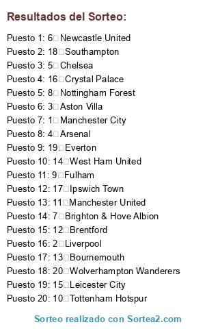 Lista de participantes: 1 Manchester City, 2 Liverpool, 3 Aston Villa, 4 Arsenal, 5 Chelsea, 6 Newcastle United, 7 Brighton & Hove Albion, 8 Nottingham Forest, 9 Fulham, 10 Tottenham Hotspur, 11 Manchester United, 12 Brentford, 13 Bournemouth, 14 West Ham United, 15 Leicester City, 16 Crystal Palace, 17 Ipswich Town, 18 Southampton, 19 Everton, 20 Wolverhampton Wanderers.