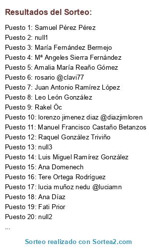 Lista de participantes: Juan Antonio Ramírez López, Ana Díaz, Fati Prior, Manuel Francisco Castaño Betanzos, Raquel González Triviño, María Fernández Bermejo, Samuel Pérez Pérez, Tere Ortega Rodríguez, Leo León González, Miriam Pasadas González, Mª Angeles Sierra Fernández, Luis Miguel Ramírez González, Ana Domenech, Amalia María Reaño Gómez, Rakel Öc, rosario @clavi77, lucia muñoz nedu @luciamn, lorenzo jimenez diaz @diazjimloren, null1, null2, null3.
