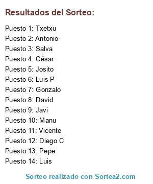 Lista de participantes: Javi, Josito, Manu, Pepe, Luis Pastor, Antonio, Luis, Salva, David, Txetxu, Gonzalo, Diego Calvo, Vicente, César.