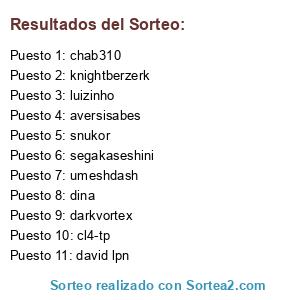 Lista de participantes: umeshdash, cl4-tp, chab310, darkvortex, aversisabes, knightberzerk, luizinho, segakaseshini, dina, snukor, david lpn.