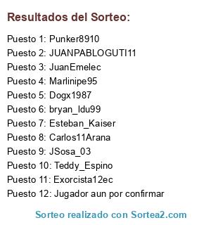 Lista de participantes: Punker8910, JuanEmelec, JUANPABLOGUTI11, Teddy_Espino, Esteban_Kaiser, Exorcista12ec, Marlinipe95, Carlos11Arana, Dogx1987, JSosa_03, bryan_ldu99, Jugador aun por confirmar.