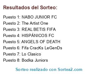 Lista de participantes: REAL BETIS FIFA, NABO JUNIOR FC, ANGELS OF DEATH, HISPÁNICOS FC, Fifa CracKs LeGenDs, Bodka Juniors, The Artist One, Lo Clasico.