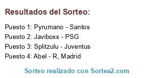 Lista de participantes: 1.- SDV JAVI LP - F.C Barcelona, 2.- Oriontfe - M. United, 3.- Abel967 - R. Madrid, 4.- Nieves74 - Inter Milan, 5.- Jose2509 - Chelsea, 6.- IVIFM - B. Munich, 7.- BOLU25 - M. City, 8.- JAVIBOXX - PSG, 9.- Brunosc - B. Dortmund, 10.- Splitzulu - Juventus, 11.- Fransolo - Atletico de Madrid, 12.- Zurante78 - Arsenal, 13.- Pyrumano - Santos, 14.- Llo soy llo - Tottenham Spurs, 15.- Lucas Kane qd - Olympique Marsella, 16.- Tickin - Zenit.