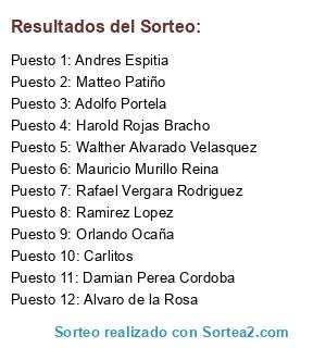 Lista de participantes: Matteo Patiño, Mauricio Murillo Reina, Adolfo Portela, Ramirez Lopez, Harold Rojas Bracho, Damian Perea Cordoba, Carlitos, Walther Alvarado Velasquez, Rafael Vergara Rodriguez, Orlando Ocaña, Andres Espitia, Alvaro de la Rosa.