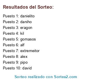 Lista de participantes: david, danielito, kil, eragon, gomasos, daniho, pipo, alex, alf, extremeitor.
