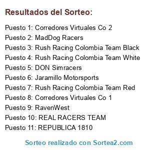 Lista de participantes: REPUBLICA 1810, DON Simracers, REAL RACERS TEAM, RavenWest, Jaramillo Motorsports, Rush Racing Colombia Team Black, Rush Racing Colombia Team Red, Corredores Virtuales Co 1, Corredores Virtuales Co 2, MadDog Racers, Rush Racing Colombia Team White.