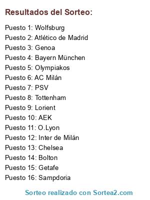 Lista de participantes: Real Madrid, Juventus, Bayern München, Valencia, Olympiakos, Palermo, FC Barcelona, Genoa.
