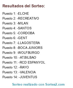 Lista de participantes: -RCD ESPANYOL, -LLAGOSTERA, -SANTOS, -RAYO, -ELCHE, -MILAN, -CORDOBA, -VALENCIA, -GENT, -RECREATIVO, -BOCA JUNIORS, -AT.BILBAO, -JUVENTUS, -WOLFBURGO.